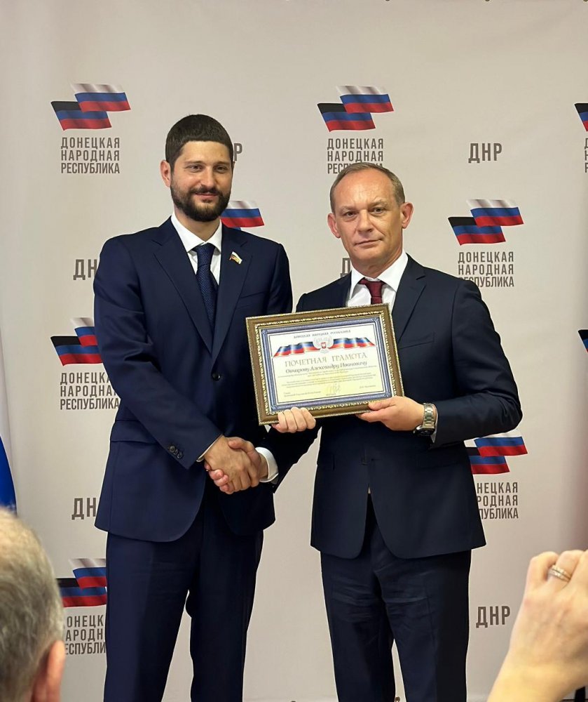 За содействие и активное участие в процессе интеграции Донецкой Народной Республики в Российскую Федерацию, а также за поддержку в реализации социальных проектов и мероприятий, направленных на оказание всесторонней помощи жителям Донецкой Народной Республики на площадке Представительства Донецкой Народной Республики в Москве состоялось награждение директора Представительства Александра Овчарова.